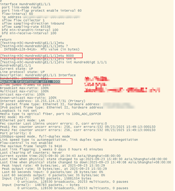 Command ip mtu: No default value. After modifying this parameter, it applies to the link layer payload length of IPv4 packets. Its precedence is higher than the MTU parameter value and is not displayed in the output of the `display interface` command (the `display interface` output only shows the MTU value).