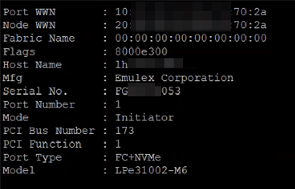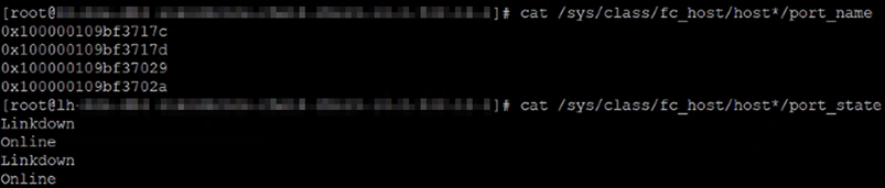 Check the port names and statuses of the FC HBA card. Removing "0x" from the port name gives the pwwn information. For example, 0x100000109bf3717c becomes 10:00:00:10:9b:f3:71:7c.