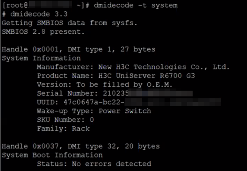 Check the server's SN again to confirm it is the server (this command is not needed for the HDM remote console; it is recommended to execute it again via ssh for confirmation). The command is dmidecode -t system.