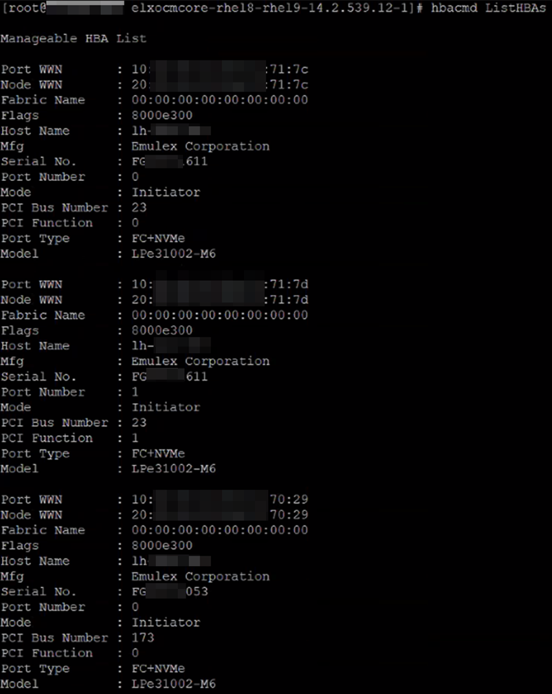 Check the list of HBA cards using the command "hbacmd ListHBAs", which can read the port pwwn and node wwn. This information is needed to identify when mounting FC storage, similar to an ID card. It is also necessary to pay attention to the Port Type. For FC+NVME, some storage devices such as DELL PowerStore 1000T need to be switched to FC mode (the two commands that take effect immediately are as follows; you can test if this is the reason):