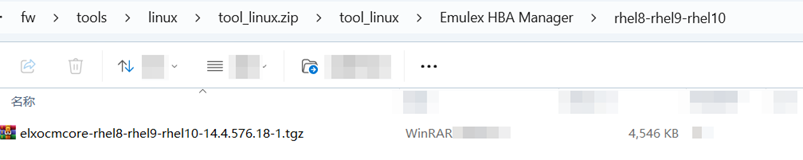 You can also use the Emulex HBA Manager tool to read FC HBA information. The tool is in the firmware version compression package. Find the corresponding operating system directory. For example, the rhel8.6 tool is in the compression package directory: fw\tools\linux\tool_linux.zip\tool_linux\Emulex HBA Manager\rhel8-rhel9-rhel10. The installation method is: tar -zxvf elxocmcore-***.tgz; switch to the decompressed tool directory, run ./install.sh, and then follow the prompt information to install the tool.